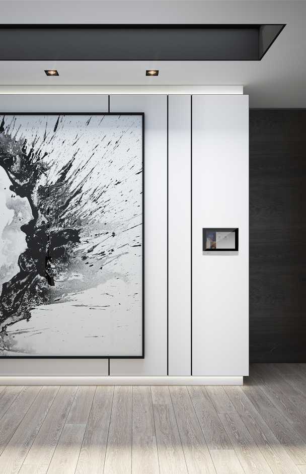 An all-in-one screen that comes in both in-wall and table-top options. Allows you to